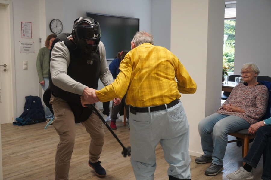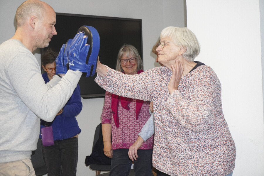 In dem Kurs wird es laut. Es darf auch ordentlich zugeschlagen werden. Was im ersten Moment etwas Überwindung kostet, macht sich in Gefahrensituationen bezahlt. Mit Gehstock, Handtasche und dem eigenen Körper verteidigen sich die Kursteilnehmenden untereinander. Was die Kursleiter vormachen, wird von ihnen geübt – so lange, bis sie sich sicher fühlen.