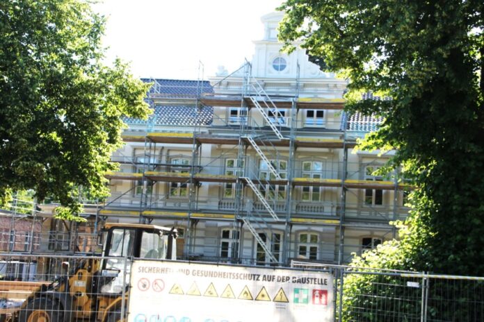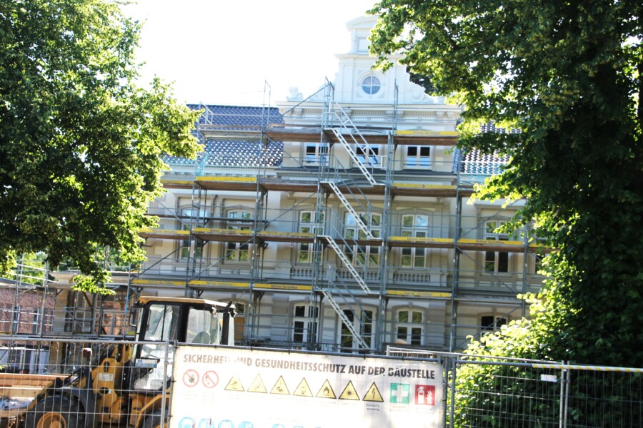 Das Herrenhaus ist zwar noch eingerüstet, aber selbst von außen ist zu erkennen, dass es ein Schmuckstück des gesamten Quartiers werden wird. Bis zum Jahresende sollen die Arbeiten abgeschlossen werden. Wer als Mieter einzieht, steht noch nicht endgültig fest. Es können sowohl einzelne Etagen als auch das komplette Herrenhaus als Büro angemietet werden.