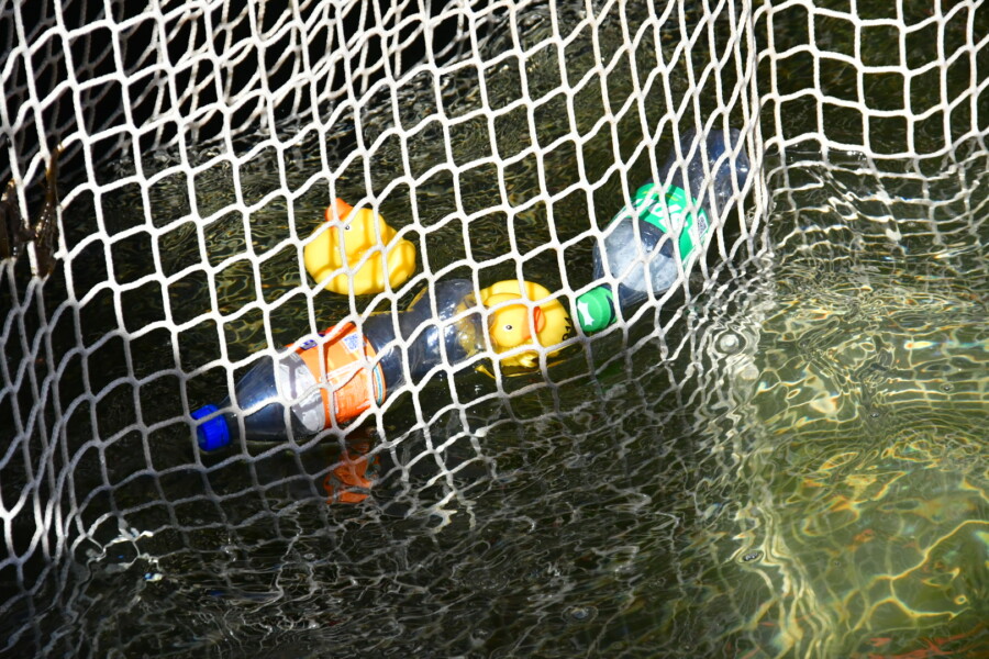 Eine dringende Aufgabe, der sich Manfred und die Ehrenamtlichen des Vereins „One Earth – One Ocean“ verschrieben haben, ist, die Menschen vom Verzicht auf Verpackungsplastik zu überzeugen, aber auch, die Meere wieder vom Plastikmüll zu befreien – eine schier gigantische Aufgabe. Dabei wissen auch die Schulkinder auf Nachfrage, was besser ist. Hier z. B. das Einkaufsnetz. Damit sich alle Schulkinder ein Bild von der Plastikbergung machen konnten, durften sie sich in kleinen Gruppen ordentlich ins Zeug legen, um ein riesiges Fangnetz am Flaschenzug aus dem eisigen Wasser der Schwentinemündung zu ziehen, in das der Kapitän vorher einige Plastikflaschen und Quietscheentchen geworfen hatte. Alle Gruppen schafften das unter großem Applaus, aber es war anstrengend. Zum Schluss mussten zur besonderen Gaudi der Kinder auch noch die Lehrer anpacken.