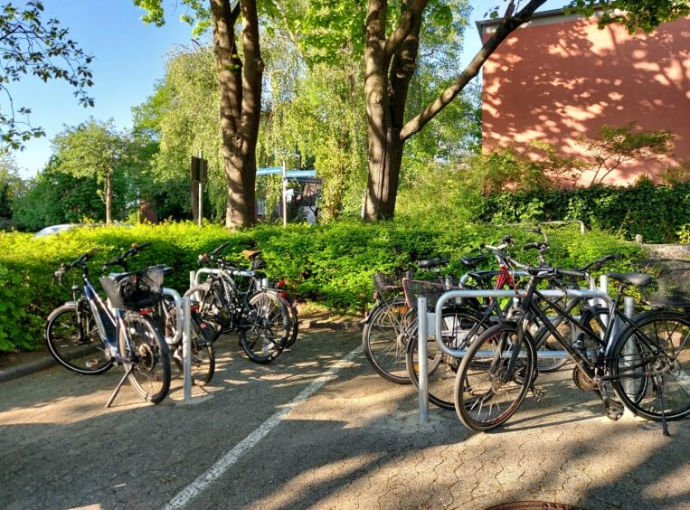 Anstelle von zwei Kfz-Parkplätzen befinden sich dort nun acht neue Fahrrad-Parkplätze. Vier Kieler Bügel wurden montiert, um dem vielfachen Wunsch nach mehr Abstellmöglichkeiten für Fahrräder nachzukommen. Pastorin Elvira Schlott erklärt, dass schon in der Vergangenheit Auto-Stellplätze weggefallen seien. Denn das Gemeindehaus stammt aus dem Jahr 1970, und die Autos sind mit den Jahren immer größer geworden, weshalb sie nicht mehr in die Parkbuchten von damals passen. Von vielen Seiten kam der Ruf nach mehr Abstellmöglichkeiten für Fahrräder. Sei es von den Kita-Eltern, den Besucherinnen und Besuchern des Gottesdienstes oder den Mitarbeitenden der Gemeinde selbst.