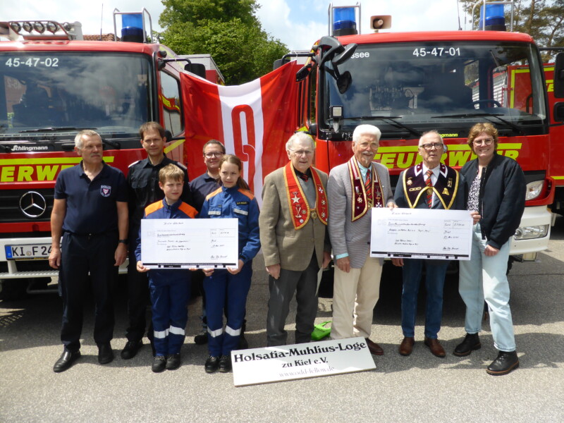 Der Orden fördert verschiedene Organisationen. „Es müssen immer eingetragene oder gemeinnützige Vereine sein, die wir unterstützen“, so Hans Peter Brandt. Alle helfen ehrenamtlich. Ihr Ziel: Mit karitativer Arbeit eine bessere Welt schaffen, und das im Verbund fester Freundschaft. Am 24. Mai überreichte die Kieler Loge im Rahmen des „Tags der offenen Tür“ bei der Freiwilligen Feuerwehr Russee zwei Spenden von jeweils 2.750 Euro an die Jugendfeuerwehr Russee und die Hospiz-Initiative Kiel „Projekt Klee“.