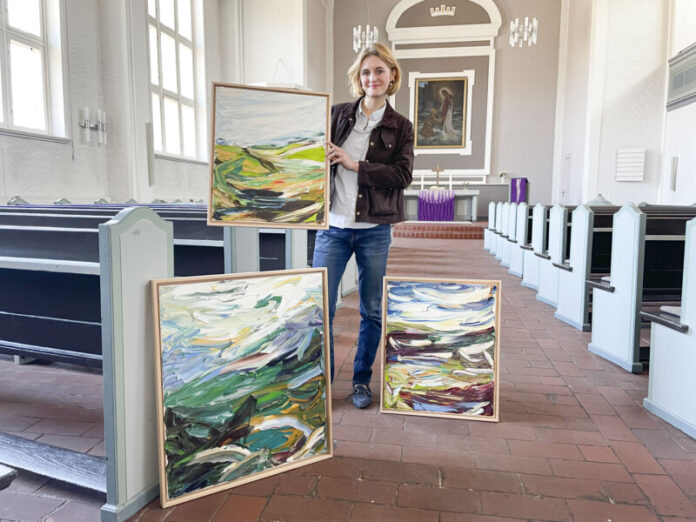 Impressionistisch-abstrakte Landschaften, positive Energie und eine geschwungene Dynamik in den immer wiederkehrenden Farbtönen Blau, Grün, Gelb und Weiß. Mit diesen Worten sind die Werke der aus Ostfriesland stammenden Künstlerin Stina Wrede wohl am besten zu beschreiben, die die Wahl-Kielerin vom 10. Mai bis zum 21. September in der Michaeliskirche präsentieren wird. „Die Werke stehen im Kontext starker Naturverbundenheit und einer Liebe zu dieser. Das passt sehr gut zur Kirche“, erklärt Stina Wrede, die sich von der Natur inspirieren lässt und z. B. im Naturschutzgebiet am Westensee immer wieder mit Staffelei und Farben anzutreffen ist. Rund zwanzig Leinwände, die größte davon in den Maßen 1,5 x 2,0 Meter, wird sie in der bevorstehenden Ausstellung rund um das Kirchenschiff zeigen. Wie der Titel „Anything flows“ vermuten lässt, werden darauf fließende Momente zu sehen sein, die einen Landschaftsbezug haben oder aber sonstige Lebendigkeit zum Ausdruck bringen. Doch nicht nur Bilder sollen während des Ausstellungszeitraums zu erfahren sein. Zusammen mit Pastorin Susanne Sengstock plant sie noch mehr. „Wir wollen auch Workshops machen“, erzählt Stina Wrede, die während ihres Studiums an der Muthesius Kunsthochschule in Kiel nicht nur ihre Liebe zur Ölmalerei entdeckte, sondern auch ihren Ursprungsgedanken nicht aus den Augen ließ: Für ein Lehramtsstudium in den Fächern Spanisch und Philosophie war sie einst aus Emden nach Kiel gekommen. Der Wunsch nach etwas Konkretem, Handwerklichem ließ sie zur Kunst wechseln. Die Freude an der Vermittlung von Inhalten an andere, insbesondere an junge Menschen, hat sie sich dennoch auch als selbstständige Künstlerin bewahrt. In ihrem Atelier lädt Stina Wrede zu impulsgebenden Workshops ein, „um ins eigene kreative Arbeiten zu kommen.“ Sie möchte inspirieren, Kunst zu schaffen und selbst zu Hause aktiv zu werden. Aber auch in der politischen Bildung ist sie als Referentin unterwegs, bietet Workshops für Schulen zu Themen wie Kunst und Demokratie an und möchte das kommunalpolitische Ehrenamt stärken. Über einen Freund, den sie aus ihrer politischen Bildungsarbeit kennt, entstand schließlich der Kontakt zur Michaelisgemeinde, deren Offenheit und weitgeistige Ausrichtung sie sehr schätzt. Als „unglaublich schön“ beschreibt sie die bisherige Zusammenarbeit und freut sich schon auf die kommenden Wochen, auf Aktionen für Familien und Kinder, für Groß und Klein. Susanne Sengstock ist ebenfalls sehr glücklich über die Kooperation mit der Künstlerin, die „mit ihrer abstrakten Kunst zum Nachdenken anregt“ und Nachhaltigkeit mit den Themen Schöpfung und Kunst verbindet. Als ersten Termin zum Vormerken nennt sie natürlich die Vernissage am 10. Mai um 15.30 Uhr in der Michaeliskirche. Weitere Aktionen wie zum Beispiel der für August geplante Workshop „Malen und Meditation“ folgen über die üblichen Kanäle. AB