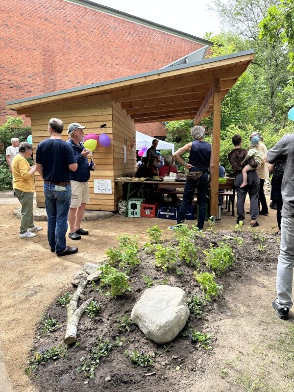 Auf der Grünfläche rechts der Uwe-Jens-Lornsen-Schule wurde am 28. Juni 2025 die sogenannte Tauschbude eröffnet. Der Name zeugt von vornehmer Zurückhaltung. Denn eine Bude ist es wirklich nicht, eher eine solide Schatzkammer, fachmännisch und individuell genau für diesen Ort zugeschnitten. Im Inneren bietet sie etwa fünf Quadratmeter Platz für Regale. Hier können alle aus der Nachbarschaft ausrangierte Dinge, die aber noch gut und nutzbar sind, reinlegen. Und sie können stöbern, ob sich unter den abgegebenen Tauschobjekten etwas befindet, was sie selbst gebrauchen können. Täglich verändert sich die Zusammensetzung des Inhalts.