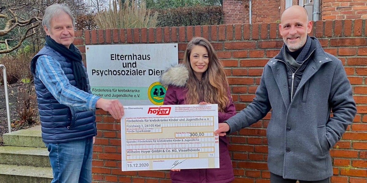 Eine beeindruckende Arbeit, wie die Hoyer-Mitarbeiter am Standort Kiel meinen. Deshalb gab es jetzt 300 Euro als Spende aus der Weihnachtsaktion der Unternehmensgruppe Hoyer für diese Einrichtung. „Wahnsinn, was hier alles geleistet wird“, sind sich der Verkaufsbüroleiter Timo Hudzietz und seine Kollegin Romina Voss bei der Spendenübergabe einig. „Von den Spenden werden Kindern und Eltern einige schöne Momente in ihrer schweren Situation ermöglicht“, so Bernd Kruse, der Vorsitzende des Förderkreises.