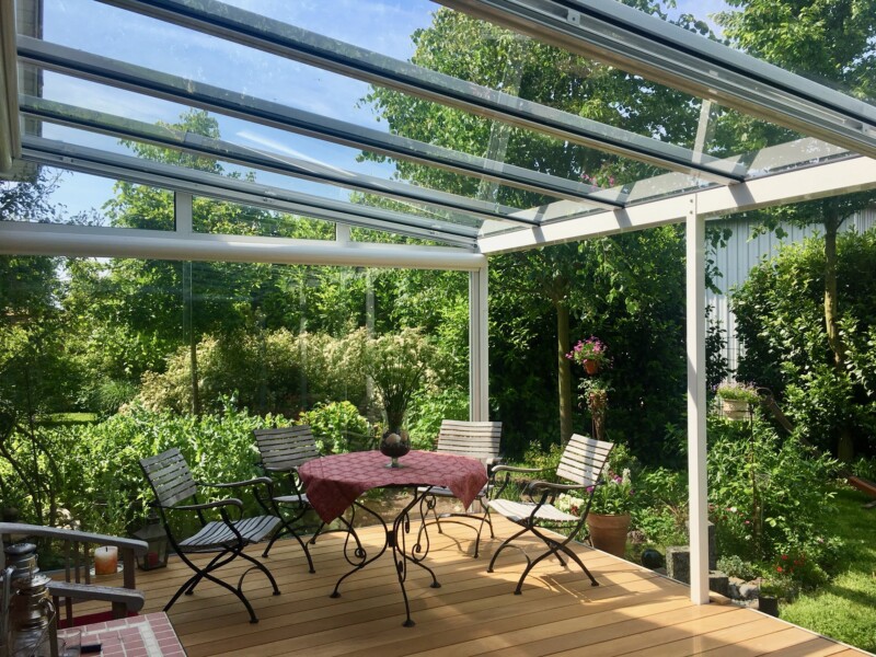 Das ist jetzt anders. „Der Entschluss, unsere Terrasse überdachen zu lassen, war eine der besten Ideen der letzten Jahre“, freut sie sich. Die Firma Nelson Park Terrassendächer wurde beauftragt, ein Terrassendach mit Ganzglasschiebeelementen zu bauen. Das moderne, schlichte Design und die großen Glaselemente sorgen für einen unverbauten Blick in den Garten. Je nach Wetterlage können die Glaselemente auf- und zugeschoben werden, damit kann man für eine optimale Belüftung und Temperatur sorgen. Problemlos könnte sich die Überdachung zu einem Kaltwintergarten erweitern lassen, der eine interessante und preisgünstige Alternative zum Warmwintergarten ist. Anders als dieser ist er weder beheizt noch isoliert.