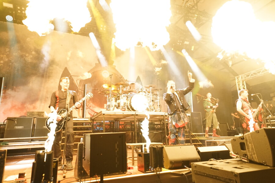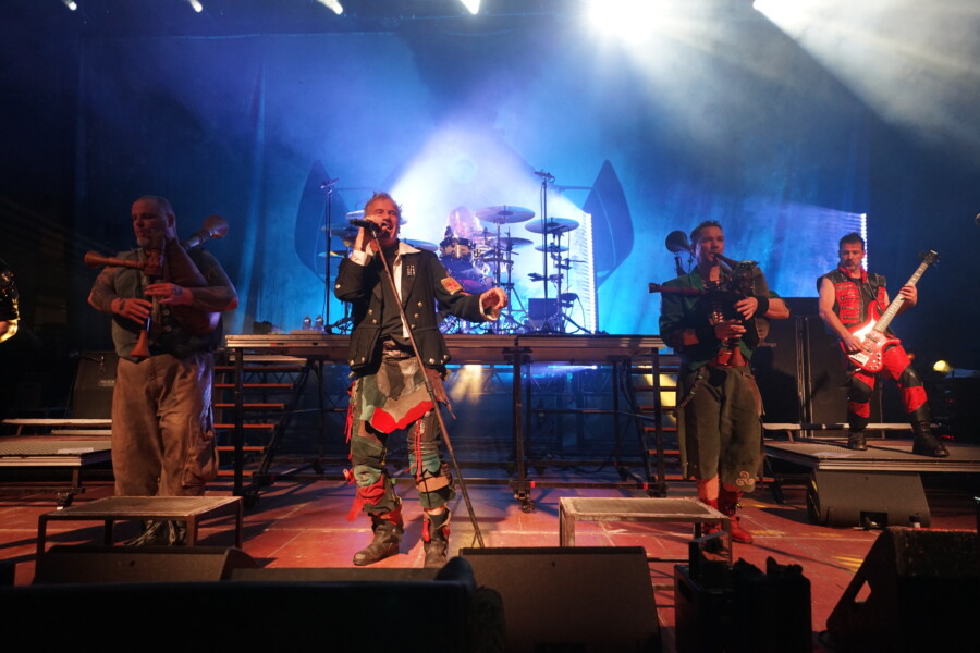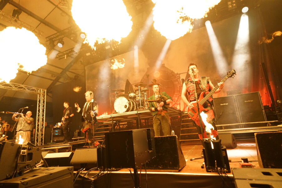 Von nachmittags 15 Uhr bis Mitternacht feierten sie bei einem halben Dutzend Bands. Mit dabei Rauhbein, Vogelfrey, Corvus Corax und Fiddlers Green. Headliner waren niemand Geringeres als In Extremo. „Wir sind keine politische Band, doch manchmal muss man Stellung beziehen“, verkündete Sänger Michael Robert Rhein. Und so trugen sie disen Abend zwei politische Songs vor. Bei „Lieb Vaterland“ wurde die Bühne förmlich mit Sperrfeuer und Flammenwerfern abgefackelt. Doch In Extremo können auch anders. Mit den Worten „Habt ihr Lust auf Party“ stimmten sie ihren Gassenhauer „Sternhagelvoll“ an. Und das ganze Publikum sang mit: „Sternhagelvoll, heute Dur und morgen Moll. Auf Schaukelschuhen durchs Leben. Was kann es Schöneres geben?“