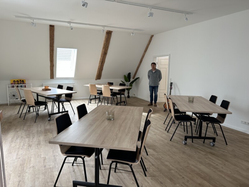 Seit Januar 2024 baut der Dachdeckermeister zusammen mit befreundeten Unternehmen den gesamten Hof zum Kulturzentrum um. In der einen Scheune sind Seminarräume untergebracht, in der anderen ein uriger Veranstaltungsraum. Arne führt uns durch die weitläufigen Räume und zeigt, was alles schon umgesetzt wurde. Er zeigt auch die aktuellen und kommenden Baustellen.