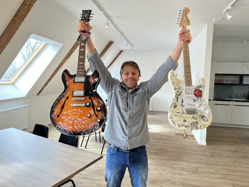 Übernachtet haben die Bands in den 80er-Jahre-Jugendzimmern im Haupthaus. Zimmer mit einem besonderen Charme, doch sie wurden in den letzten Jahren alle modernisiert. Entstanden sind sieben moderne Ferienwohnungen. Für die individuelle Note sorgen musikbezogene Extras: hier ein Radio als Marshall-Verstärker, dort eine Schlagzeug-Drum als Tisch oder eine E-Gitarre an der Wand. Gitarren zieren auch das Büro und die ausgebaute Scheune. Diese Gitarren sind allerdings übersät mit Autogrammen – jedes Jahr vom Angeliter Open Air auf einem Korpus. „Vielleicht versteigere ich die irgendwann“, überlegt Arne Eggert.