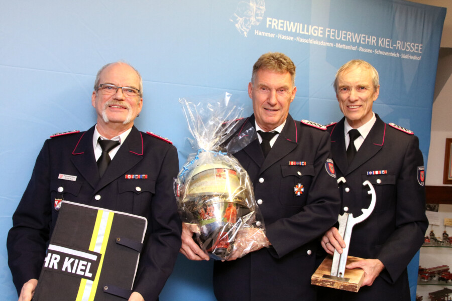 Wer sich in der FF Russee engagiert, scheint überdurchschnittlich häufig lange dabei zu bleiben. So gab es während der Versammlung mehrere besondere Ehrungen für große Verdienste im Feuerwehrwesen. Günter Jahns ist 1969 in die Jugendfeuerwehr Russee eingetreten und war neben Uwe Maaß Teil der Wehrführung. Er hat die Ausbildung der FF ab Mitte der 1990er-Jahre Schritt für Schritt modernisiert und maßgeblich geprägt. Von 1982 bis Ende 2025 war Jahns Atemschutzgeräteträger – „ein echtes Vorbild für jedes aktive Mitglied im Feuerwehrdienst“, bemerkte Stadtwehrführer Hans Bernhard Hassenstein während der Ehrung. Auch beruflich setzte er sich für die Feuerwehr Kiel ein. Für seine Verdienste erhielt Günter Jahns das Schleswig-Holsteinische Feuerwehr-Ehrenkreuz in Gold.