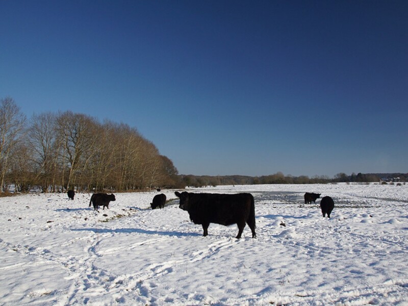Egal ob es windet, stürmt oder schneit, die Galloways sind auch im Winter im Stiftungsland Hammer, direkt vor den Toren Kiels, unermüdlich für den Naturschutz im Einsatz – sprich: sie fressen! Das schleswig-holsteinische Schmuddelwedda sind sie gewohnt. In ihrer Heimat im Südwesten Schottlands ist es ähnlich: klirrende Kälte und eine dichte Schneedecke machen ihnen also nichts aus! Für den wärmenden Wintermantel hat Mutter Natur mit einem dichten Fell gesorgt. Ein Stall wäre also nur überflüssiger Luxus. Hinzu kommt noch, dass die Wohlfühl-Temperaturen der Vierbeiner in etwa 15 Grad unter denen der zweibeinigen Schleswig-Holsteiner*innen liegen.