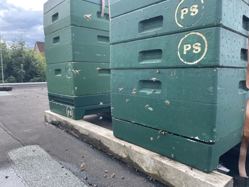 Mitte Juni und Anfang Juli war sein markant dekoriertes Imkerei-Auto auf dem Parkdeck des REWE-Centers zu sehen. Denn gleich daneben, auf dem für die Öffentlichkeit unzugänglichen Flachdach zum Winterbeker Weg hin, stellte Philipp Sosnowski zusammen mit Moritz Breske die Bienen auf. Zwei unauffällige, dunkelgrüne Kistentürme, verzurrt mit einem gelben Spanngurt. Natur, wo sie keiner erwartet. Gut erreichbar für den Imker selbst und weit genug entfernt von den einkaufenden Kundinnen und Kunden. Mit einer direkten Einflugschneise zum Grün der Linden des Winterbeker Wegs. „Sommertracht mit Lindenblüte“ soll die Sorte der fleißigen REWE-Bienchen auch dementsprechend heißen.